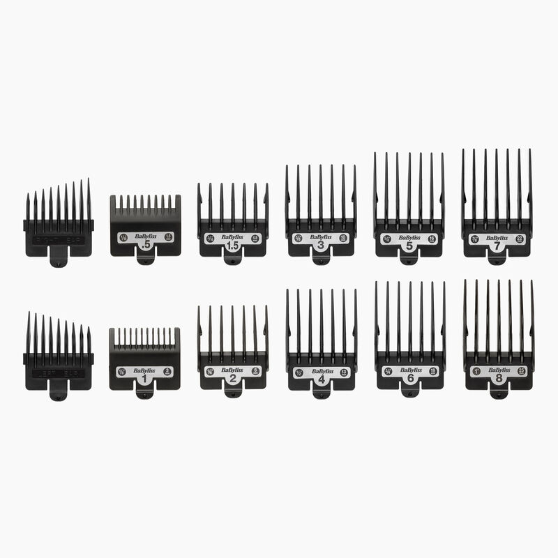 В комплект входят 12 насадок, которые всегда гарантируют безупречный результат. Машинка для стрижки BaByliss E992E имеет 10 стандартных направляющих с высотой стрижки от 1,5 до 25 мм (каждая направляющая имеет свою метку) и 2 направляющих для ушей, левое и правое.
